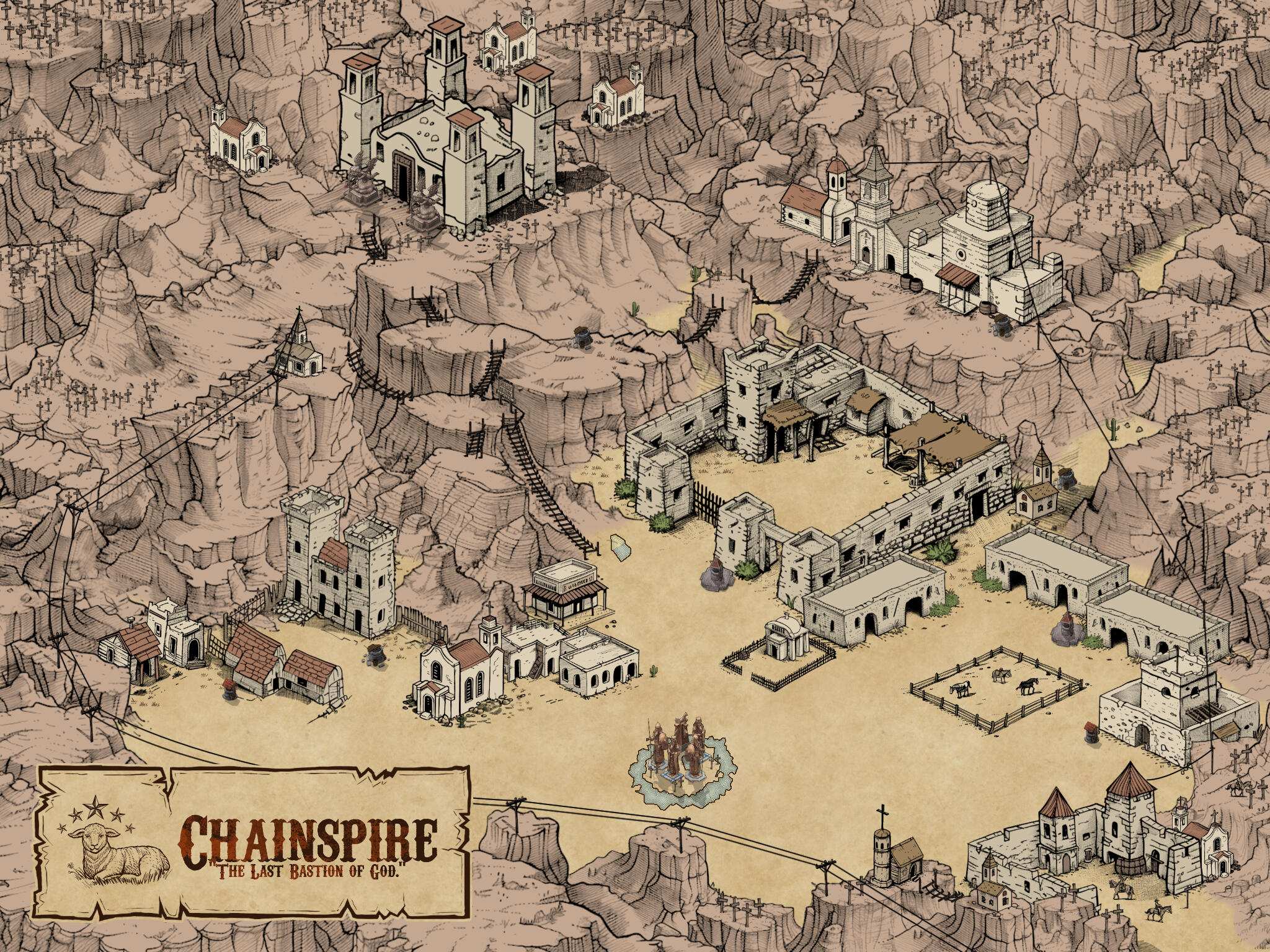 But ingenuity has its price, and Ashstead isn’t without its struggles. The town’s machines break down more often than they run, and the brackish water has a way of turning stomachs and minds sour. The sandstorms that sweep through the Chainlands can bury entire homes in a single night, and there’s always the risk that a band of outlaws or a False Angel might see Ashstead as easy pickings.There’s also the lingering fear of Chainspire, looming just to the north like a shadow that won’t let go. The church doesn’t pay much attention to Ashstead—yet. But the town’s independence is a thorn in the side of the faithful, and it’s only a matter of time before the iron chains of Chainspire reach south to claim it.