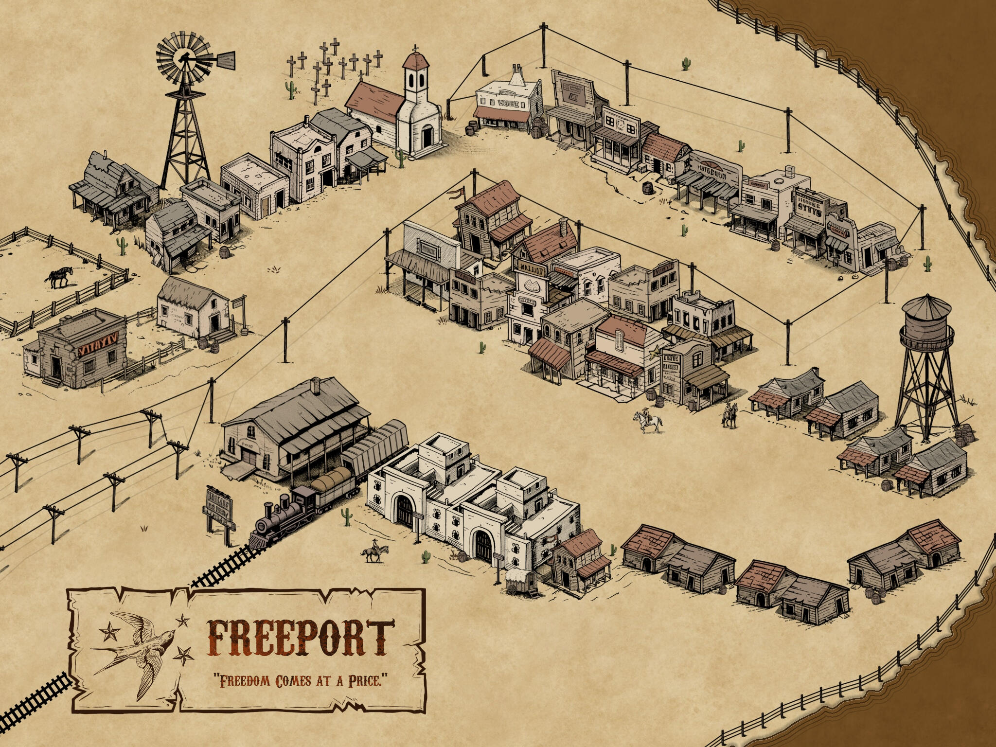 Freeport stands at the edge of the Sunken Frontier, a town of traders, outlaws, and those desperate enough to gamble everything for one last chance. The Vultures circle close, drawn by the scent of opportunity, but here, even the air feels restless.